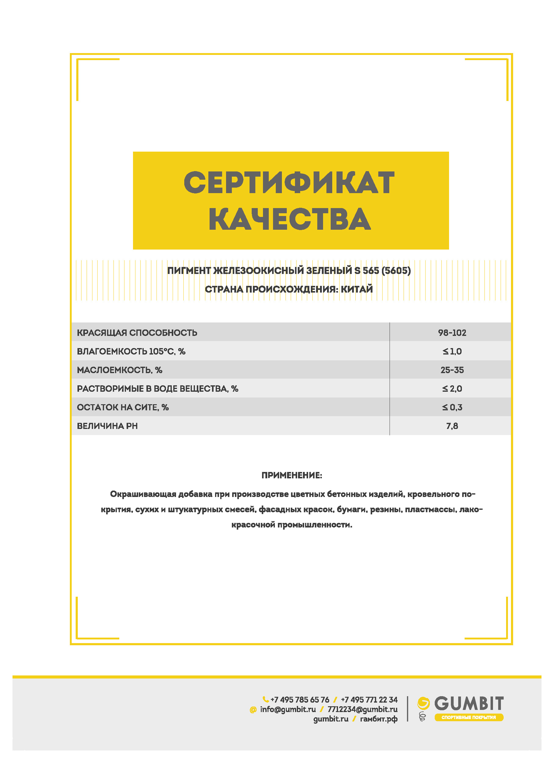 Данный пигмент используется для стабилизации цвета и увеличения светостойкости синего пигмента в резиновых покрытиях. Также данный пигмент может использоваться для расширения цветовой гаммы покрытий